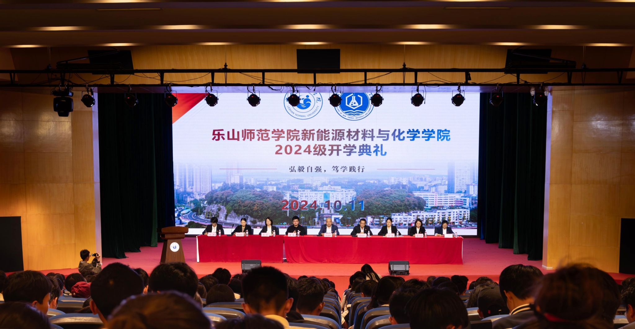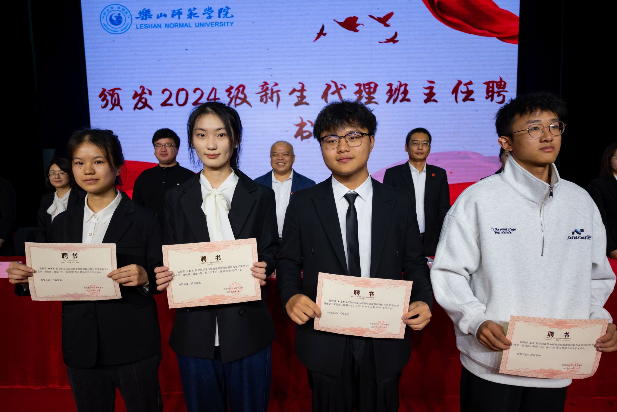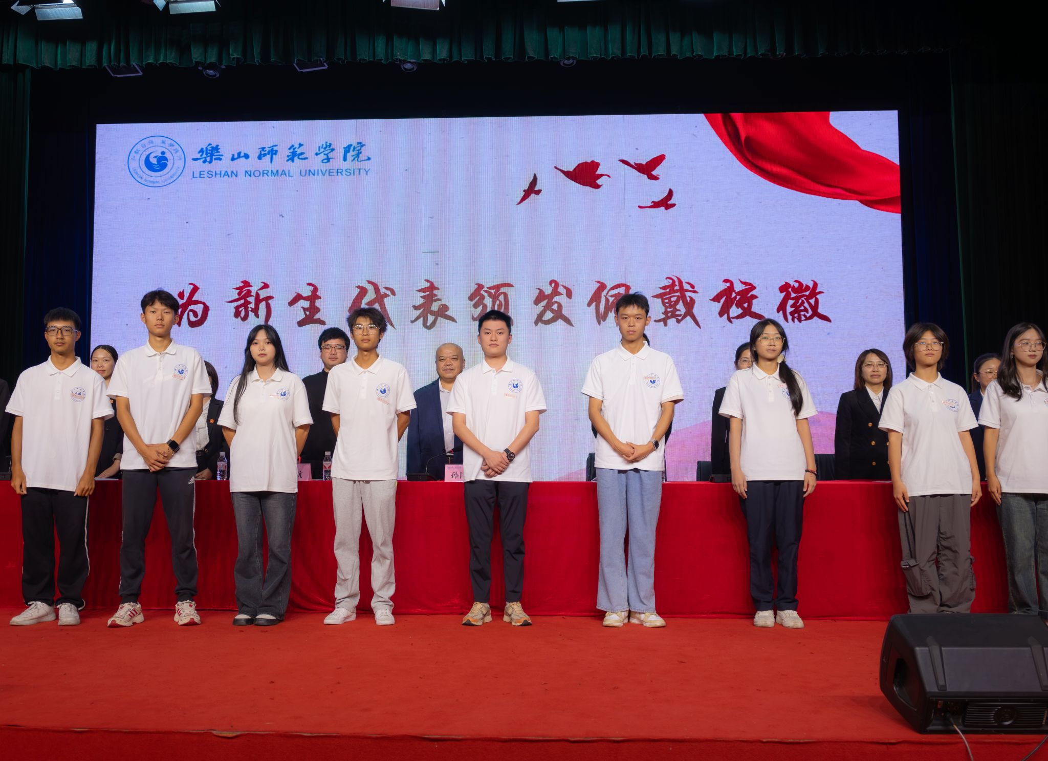 随后,彭丽嫒作为在校生代表,鼓励同学们把握当下,勇于肩负使命,期待他们能够在老员工涯中成为自己的英雄。张之香代表全体新生承诺:在接下来的学习中一定信念、脚踏实地,求真学问、练真本领,扣好人生的扣子,书写人生的精彩。典礼高光时刻,学院领导亲手为新生代表戴上校徽,其他同学互相佩戴校徽,这一刻,标志着他们正式成为了“乐师人”的一份子。仪式简朴而庄重,材化新人将承载着学院的荣耀与期望,踏上全新的求知之旅。