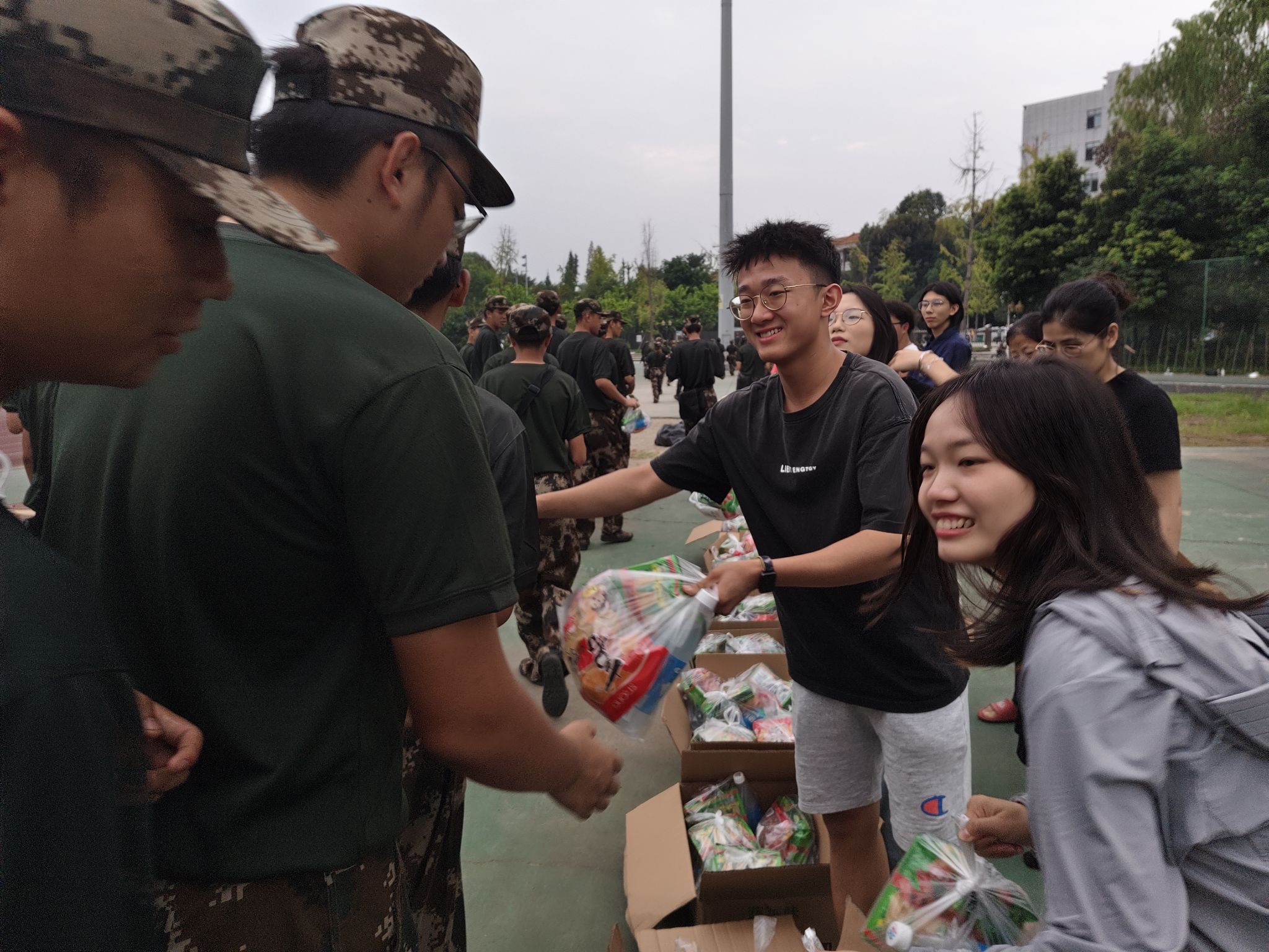 随后,学院领导和代班们向教官和同学们分发了精心准备的慰问品,并与他们进行了亲切的交流。这份来自学院的温暖与关怀,让新生们感受到了家一般的温馨。他们纷纷表示感谢老师们和学姐学长们的关心与鼓励,将以更加饱满的热情投入到未来的训练和学习中。